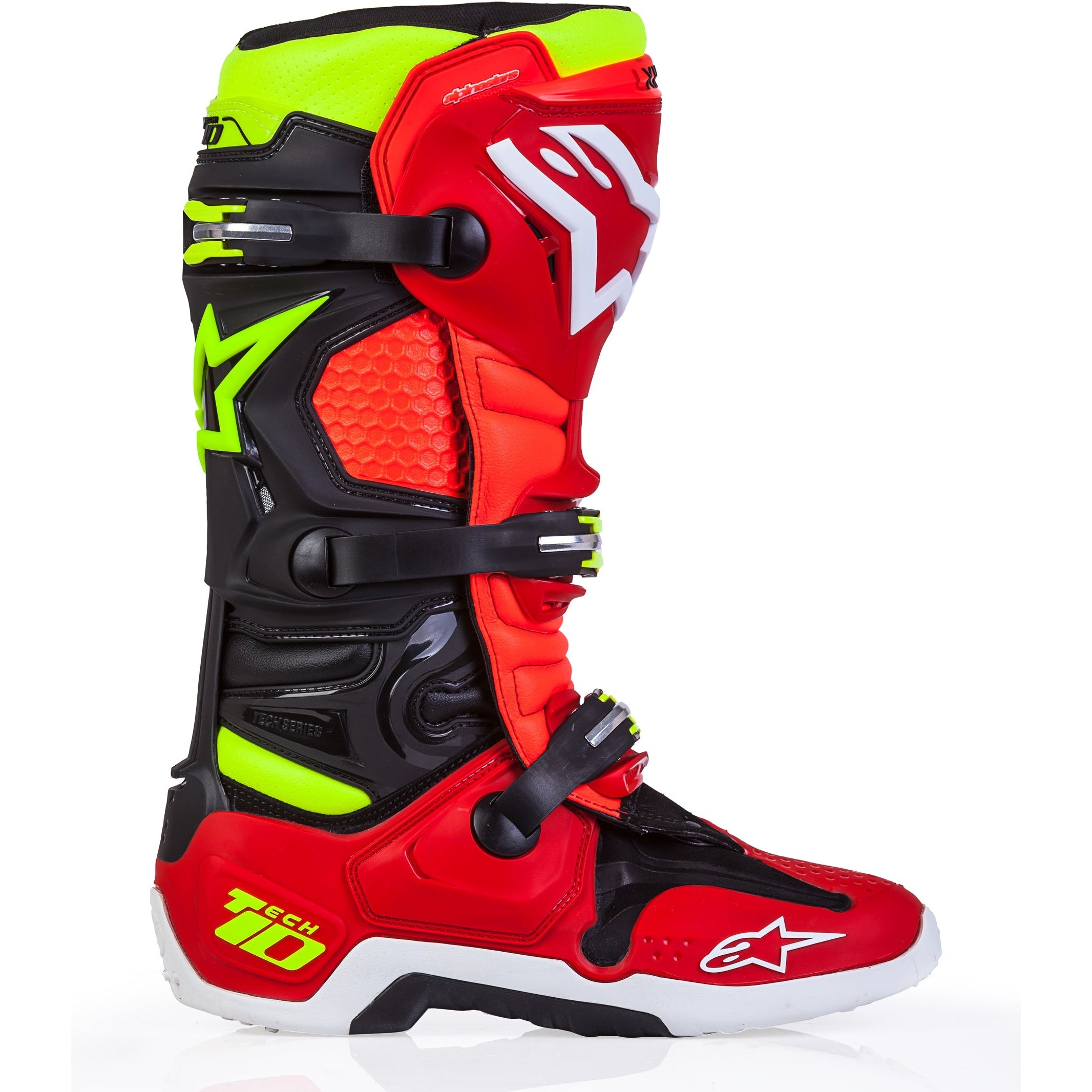 The Tech 10 has set the standard for Motocross boot performance and protection for well over a decade and for summer 2018 the completely re-designed Tech 10 boot raises the performance envelope even further. Perfection through innovation; while maintaining the iconic Tech 10 look, the new boot represents an entirely new approach - improving its ability to give a rider the ultimate in feel, comfort and safety. The Tech 10’s re-design has been guided by three priorities as the Alpinestars technical footwear development team looked to improve overall functionality, performance and safety, decrease weight and reduce material volume. Maximizing these priorities is the key achievement of the new Tech 10 and the result is an all new boot with a greater range of movement and flexibility while offering better control over the flexion and torsion forces that significantly improve boot performance, giving the rider greater confidence and protection.