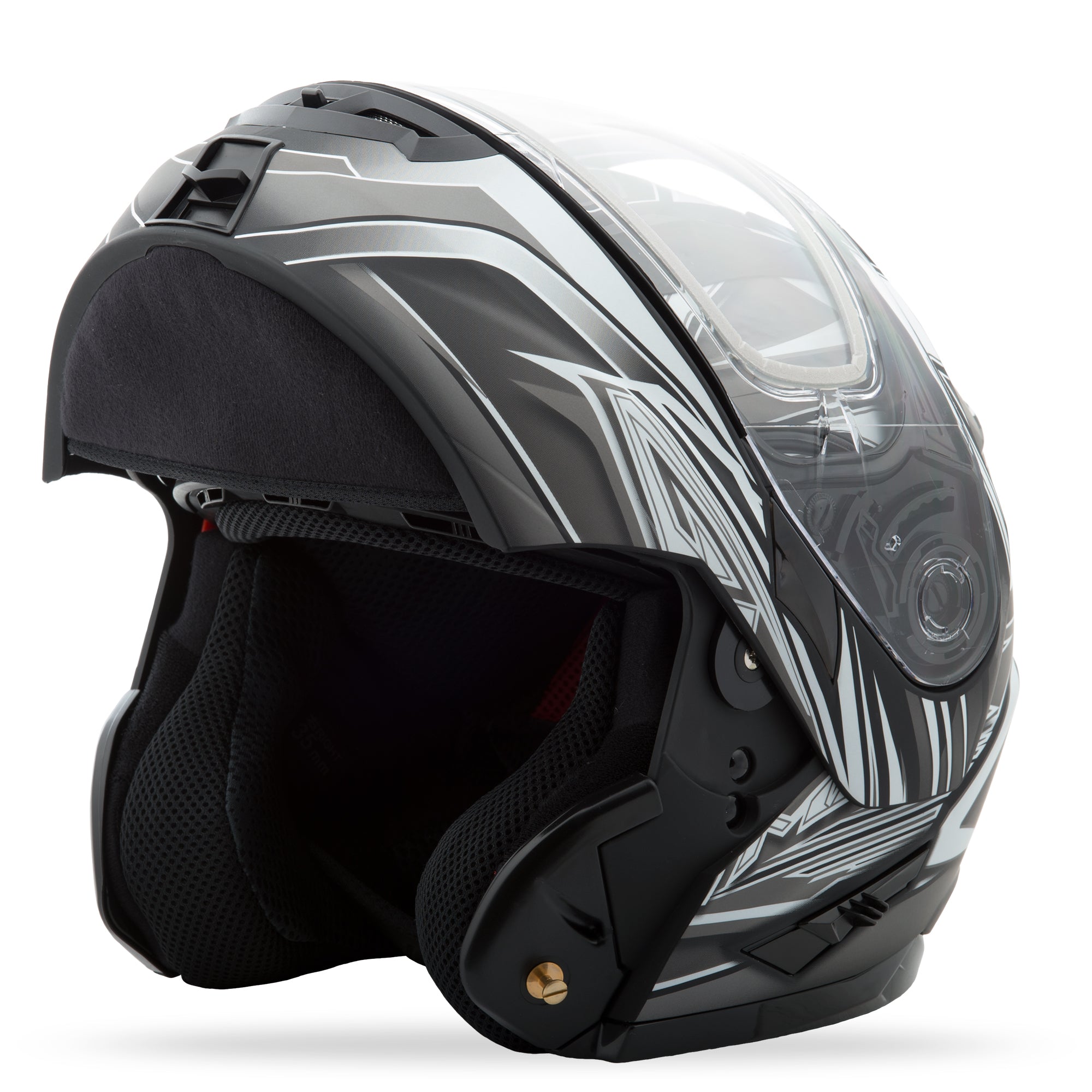 - “Dual Pivot” modular jaw design allows the flip jaw to rotate further back and sit low on the crown of the helmet. This increases the line of sight when in the raised position and it lessens fatigue by maintaining an even distribution of weight