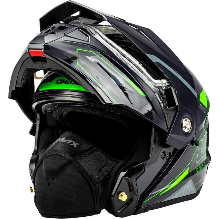 Hit the trails in comfort and safety in the stylish new MD-74 modular ADV helmet from GMAX. MD-74 checks all the boxes for adventure and snow riders who prefer the convenience of flip-up modular helmets. Features like drop down inner shield, removable neck curtain and breath box, 3 closeable vents, and available dual pane and electric shields make for an outstanding package for snowy adventures. Ride with or without the peak visor, neck curtain and breath box, and switch to a single pane shield, and your MD-74 is ready for warm weather.
