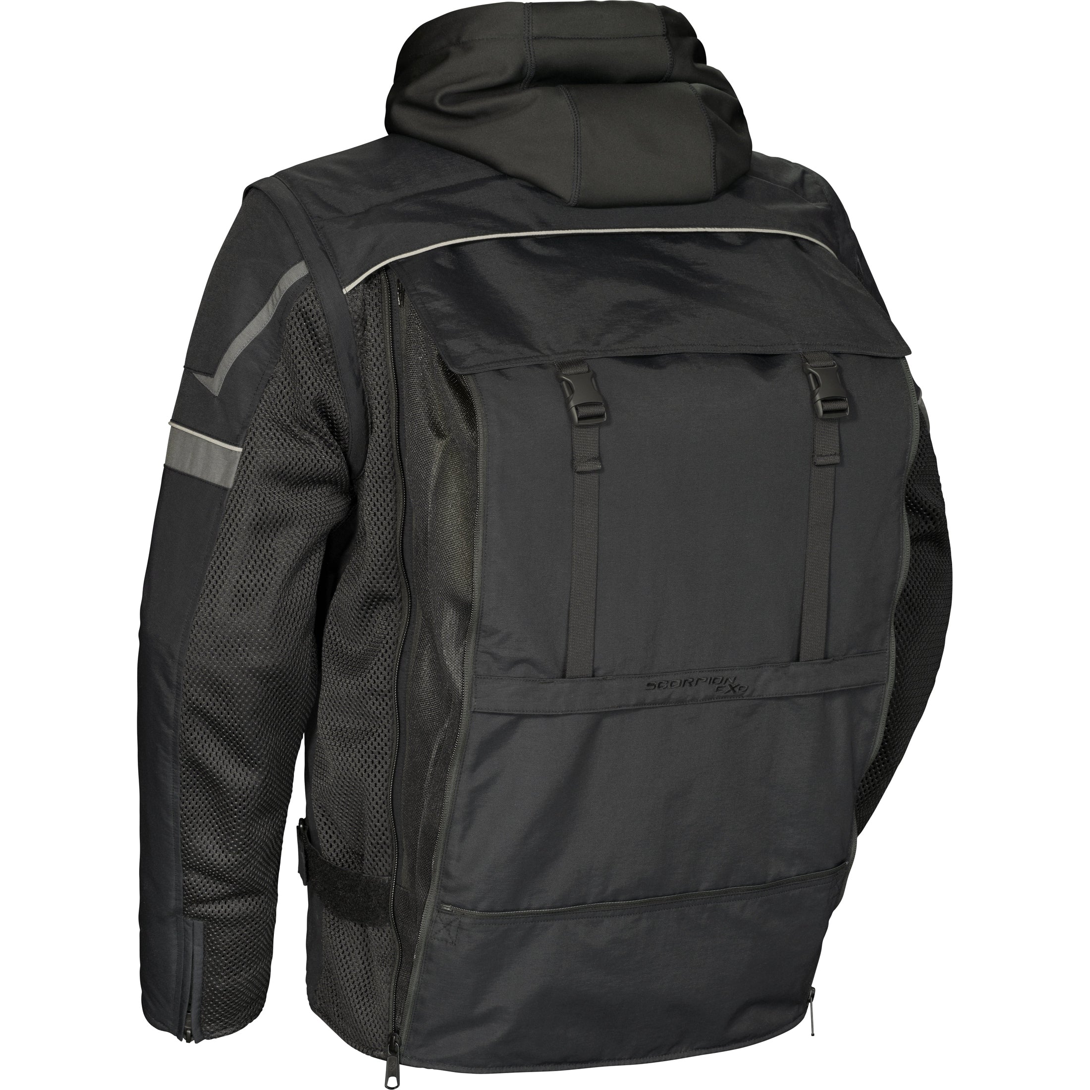 The Transformer Jacket by Scorpion EXO can be worn multiple ways to match a variety of weather conditions When temps get cold, wear the softshell hoodie under the mesh outershell. When temps heat up, remove the hoody and tuck away the back panel for maximum airflow. You can even zip off the sleeves and transform the jacket into a vest or wear the hoody alone. All this plus our patent pending backpack feature will transform your riding experience