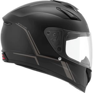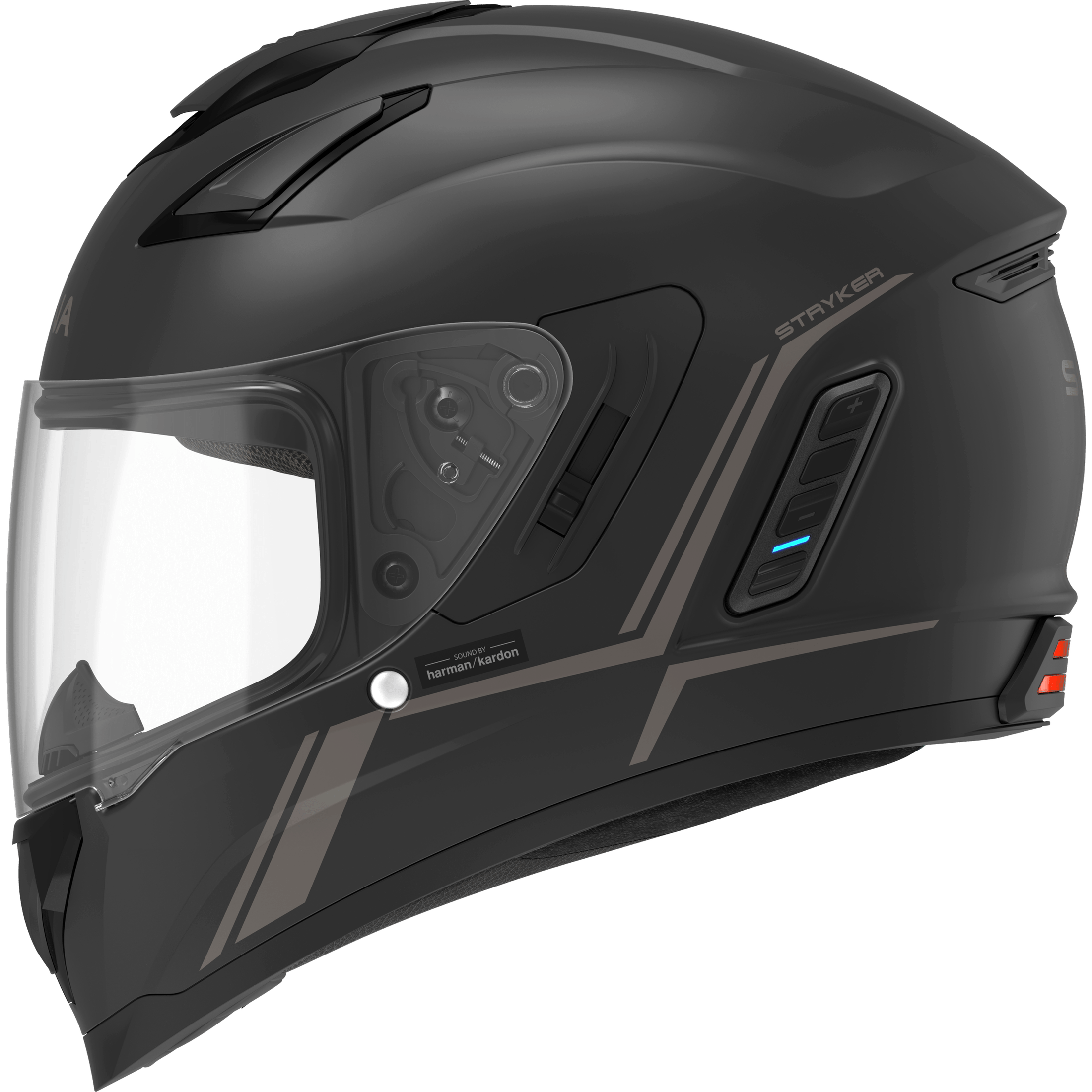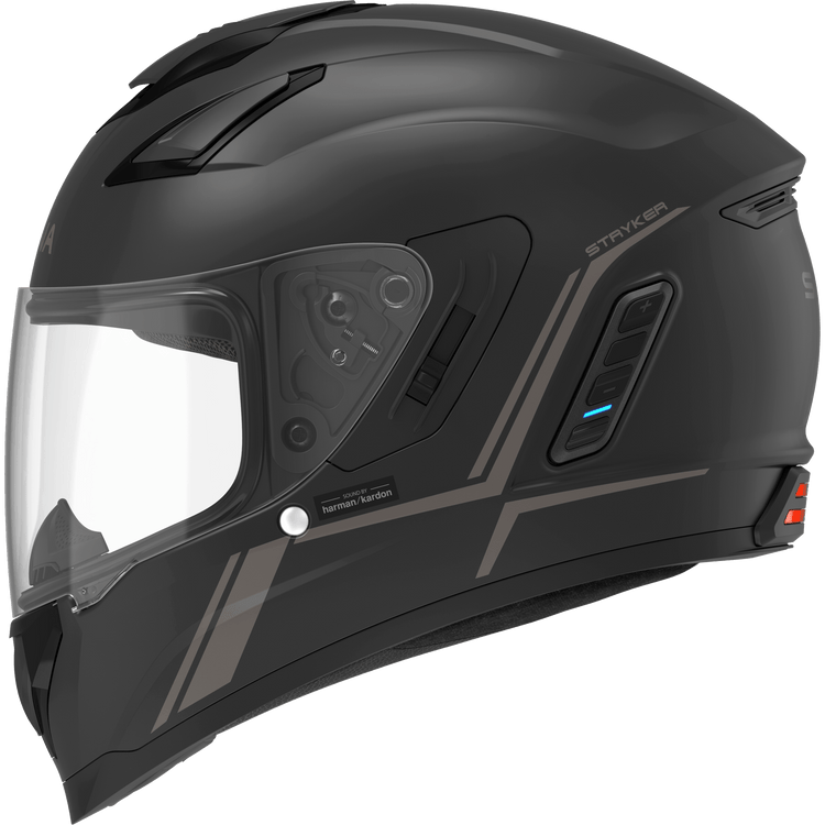 The Stryker is Sena’s latest full face smart helmet, equipped with both Mesh Intercom™ and Bluetooth® Intercom technology plus premium speakers and microphone by the audio experts at Harman Kardon. Stryker’s seamlessly integrated speakers bring a new level of precision and clarity to in-helmet audio as well as a newly designed microphone for unprecedented outbound audio quality. The Stryker helmet is packed with premium features including an integrated taillight and a convenient retractable sun visor. The helmet features a DOT-rated composite fiberglass shell and offers an impressive seven-vent design with an intermediate oval fitment.
