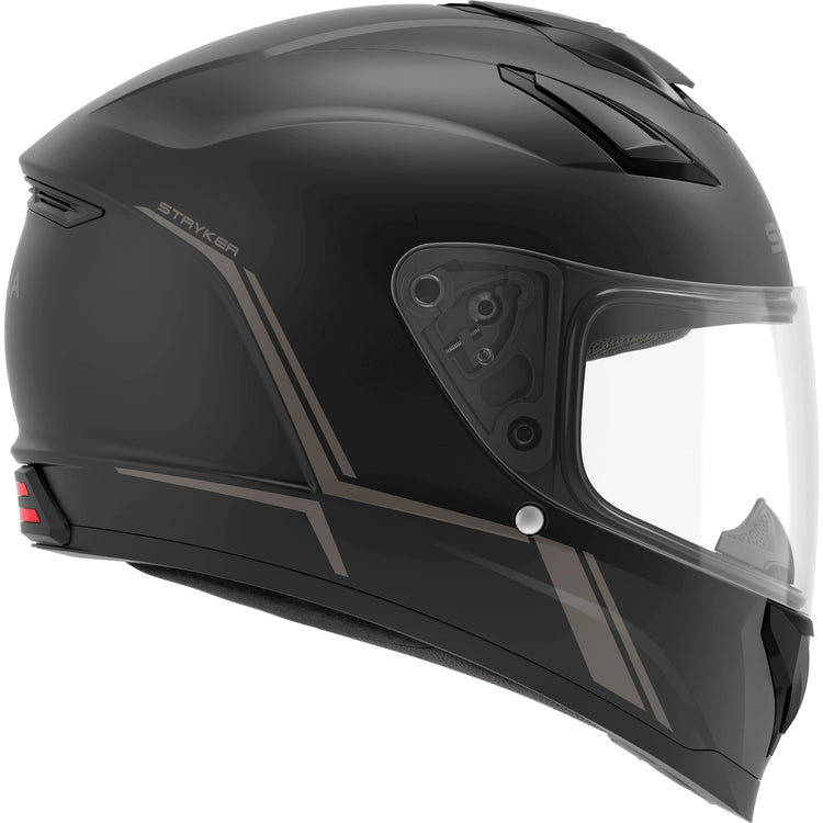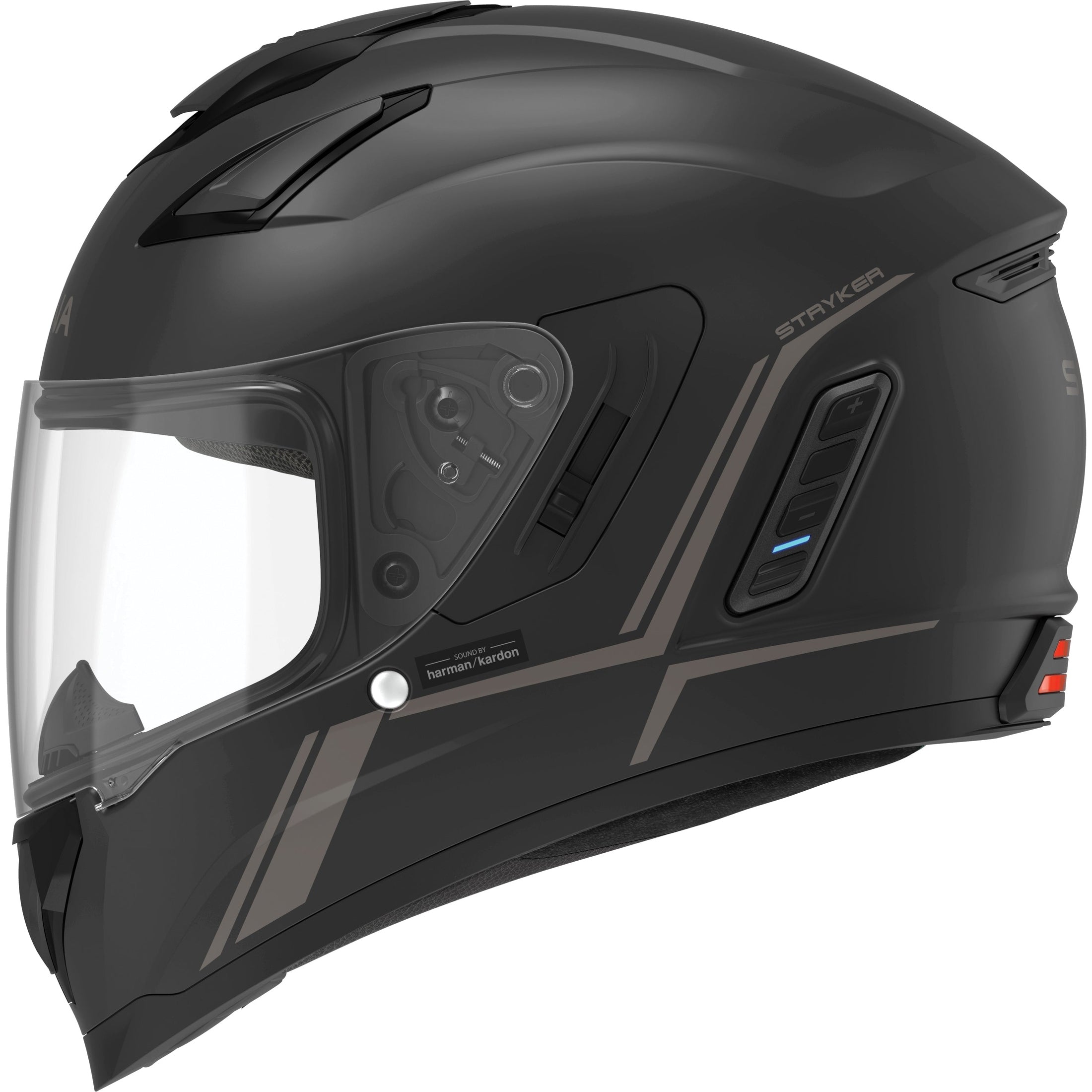The Stryker is Sena’s latest full face smart helmet, equipped with both Mesh Intercom™ and Bluetooth® Intercom technology plus premium speakers and microphone by the audio experts at Harman Kardon. Stryker’s seamlessly integrated speakers bring a new level of precision and clarity to in-helmet audio as well as a newly designed microphone for unprecedented outbound audio quality. The Stryker helmet is packed with premium features including an integrated taillight and a convenient retractable sun visor. The helmet features a DOT-rated composite fiberglass shell and offers an impressive seven-vent design with an intermediate oval fitment.